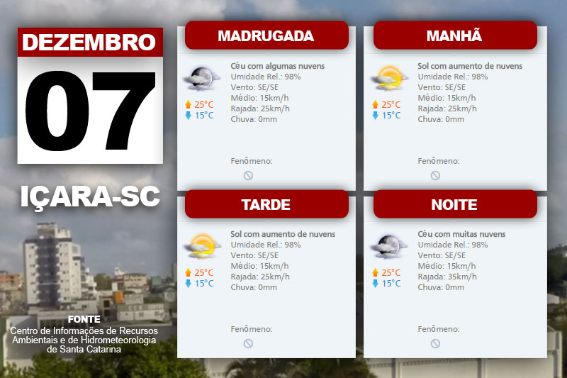 O Sol aparece entre poucas nuvens na maior parte do dia nesta sexta-feira, dia 7. Mas ainda há chance de chuva à noite no Litoral Norte e faixa litorânea de Florianópolis. O Centro de Informações de Recursos Ambientais e de Hidrometeorologia de Santa Catarina indica também temperatura baixa pela manhã e em elevação à tarde.