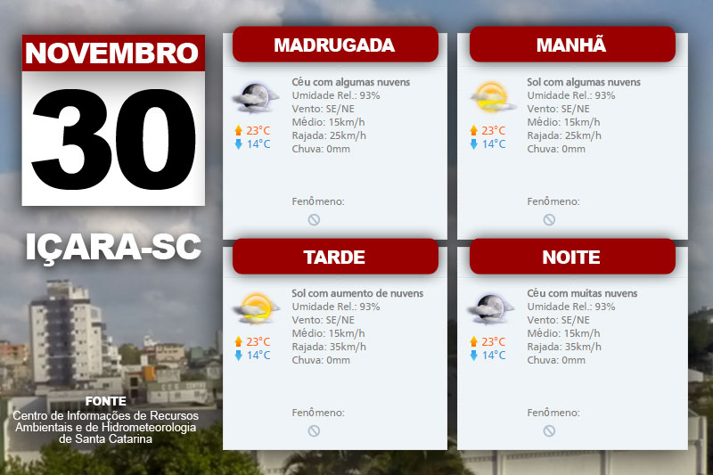 O sol aparece em todas as regiões do estado pela manhã. Todavia, a nebulosidade aumenta a tarde nas áreas mais próximas ao Paraná com chuva isolada à noite no Planalto Norte e Litoral Norte. O Centro de Informações de Recursos Ambientais e de Hidrometeorologia de Santa Catarina indica ainda temperatura elevada no Oeste e mais baixa no Litoral.