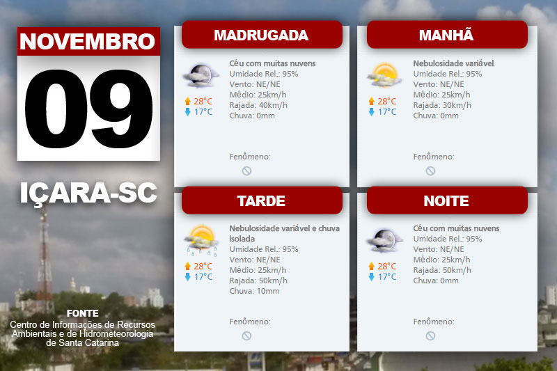 Do Planalto ao Litoral, períodos de maior nebulosidade serão intercalados com aberturas de Sol nesta segunda-feira. O Centro de Informações de Recursos Ambientais e de Hidrometeorologia de Santa Catarina indica também vento fraco a moderado, de leste a nordeste no litoral e de nordeste a norte no interior do estado.