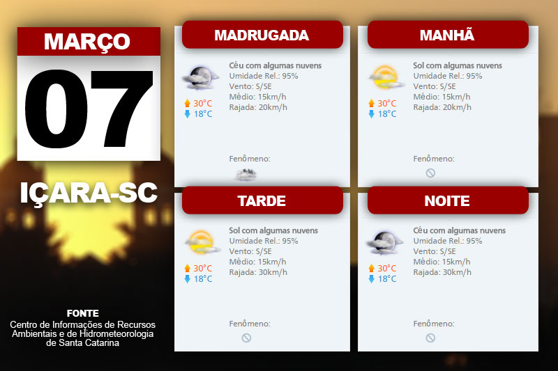O Sol aparece entre nuvens em Santa Catarina. E conforme o Centro de Informações de Recursos Ambientais e de Hidrometeorologia de Santa Catarina, manterá a temperatura elevada. Na Grande Florianópolis e Litoral Norte a chance de chuva passageira aumenta especialmente a noite.