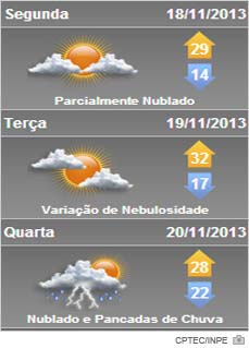 Para esta segunda-feira a previsão é de Sol entre algumas nuvens em Santa Catarina, mas com temperatura em elevação. Na terça-feira ocorre Sol com aumento de nuvens no decorrer do dia e pancadas de chuva com trovoadas entre a tarde e noite devido a um sistema de baixa pressão entre o RS e SC. Risco de temporal com ventania e granizo isolado. A perspectiva é que as temperaturas cheguem até a 30ºC nesta semana.