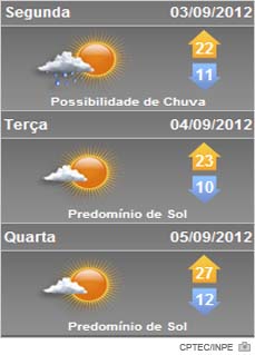 Conforme a Epagri/Ciram de terça a quinta o Sol aparece entre nuvens em boa parte do estado. Na terça há condições de chuva fraca e isolada no Litoral devido a circulação marítima. Temperatura mais baixa na madrugada e à noite, e em elevação durante o dia. Os índices variam dos 8ºC aos 26ºC.