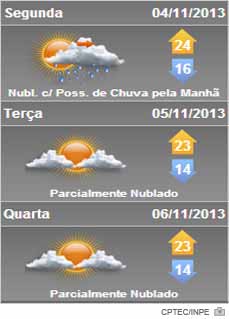 No decorrer desta segunda-feira, o Sol predomina com a chegada de uma massa de ar seco. Temperatura mais amena. Vento de sul a sudeste, moderado com rajadas de 50 a 65km/h. Para o período entre terça e quinta-feira, a previsão é então de Sol entre nuvens. Temperatura também amena, mais elevada à tarde. Vento de sudeste a leste/nordeste, fraco a moderado com rajadas. A perspectiva é para máximas de 28ºC.
