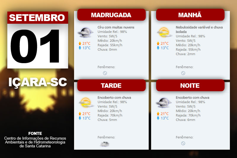 “A temperatura diminui na faixa leste do estado. Vento de sudoeste a sul, moderado, com rajadas de 50 a 70 km/h no Planalto Sul e Litoral”, aponta a meteorologista do Centro de Informações de Recursos Ambientais e de Hidrometeorologia de Santa Catarina, Gilsânia Cruz.