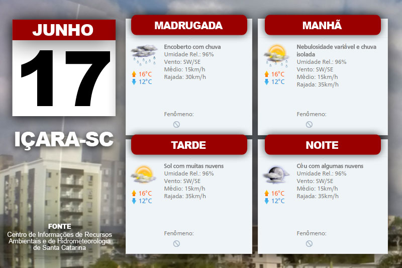 A chuva fraca a moderada persiste da madrugada até a manhã do Planalto ao Litoral nesta sexta-feira. No decorrer da tarde a instabilidade retorna com pancadas de chuva no Oeste, Meio Oeste Vale do Itajaí, Planalto Norte e Litoral Norte. O Centro de Informações de Recursos Ambientais e de Hidrometeorologia de Santa Catarina indica ainda temperatura agradável e mais elevada em relação aos dias anteriores, além de vento sudoeste a sudeste, fraco a moderado, com rajadas no Litoral.