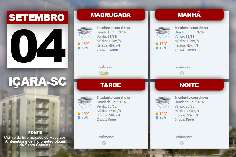 Mais nuvens e chuva ocorrem com temperatura também amena entre o Planalto e o Litoral nesta sexta-feira. Já no Oeste e Meio-Oeste, a temperatura aumentará mesmo com o Sol entre muitas nuvens. “Vento de sudeste, fraco a moderado, com rajadas mais intensas no Litoral”, indica a meteorologista do Centro de Informações de Recursos Ambientais e de Hidrometeorologia de Santa Catarina, Laura Rodrigues.