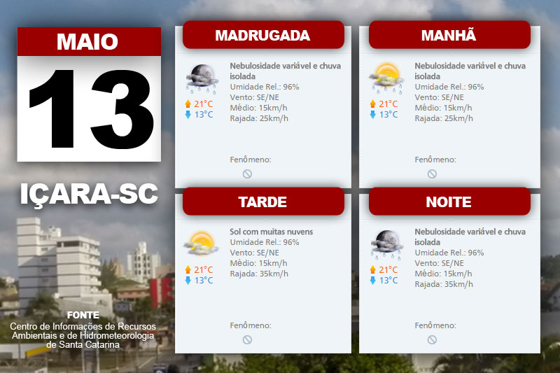 O sol aparece com muitas nuvens em todo o estado nesta sexta-feira. A nebulosidade ocorre junto também com chuva fraca no início e fim do dia no litoral. O Centro de Informações de Recursos Ambientais e de Hidrometeorologia de Santa Catarina indica ainda temperatura baixa no amanhecer e em ligeira elevação no decorrer do dia, vento sudeste a nordeste, fraco a moderado.