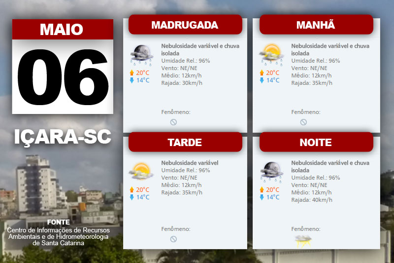 A chuva no Litoral pela manhã poderá se estender com pancadas isoladas e descarga elétrica em todas as regiões catarinenses na tarde desta sexta-feira. O Centro de Informações de Recursos Ambientais e de Hidrometeorologia de Santa Catarina indica ainda temperatura amena pela manhã e em gradativa elevação, além de vento nordeste, fraco a moderado.