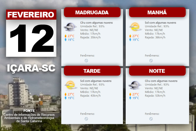 O Sol continua entre algumas nuvens em quase todas as regiões do estado nesta sexta-feira. Para o Extremo Oeste estão previstas também pancadas de chuva entre a tarde e noite. O Centro de Informações de Recursos Ambientais e de Hidrometeorologia de Santa Catarina indica ainda temperatura elevada.