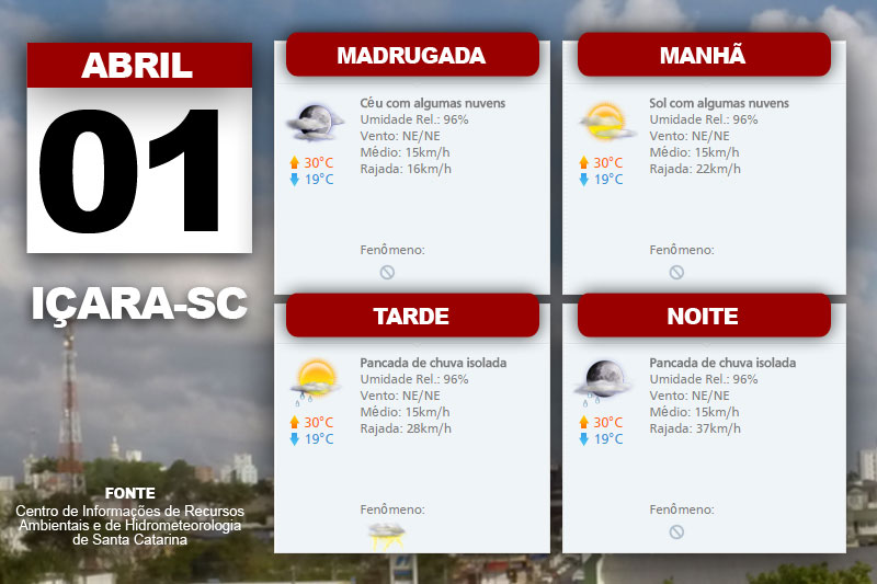 O sol ainda aparece entre muitas nuvens nesta sexta-feira. Além disso, continua a condição de pancadas isoladas de chuva e trovoadas a partir da tarde em todas as regiões. O Centro de Informações de Recursos Ambientais e de Hidrometeorologia de Santa Catarina indica ainda temperatura elevada. A previsão é de vento nordeste, fraco a moderado, com rajadas.