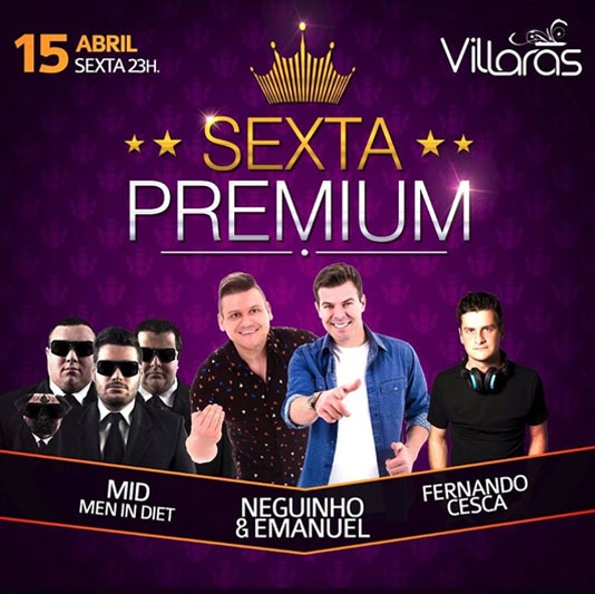 A Sexta Premium do Villaras terá Men In Diet, Fernando Cesca e Neguinho & Emanuel nesta semana. A festa no casarão do bairro Liri acontecerá a partir das 23h com acesso livre para mulheres com nome na lista que chegarem cedo. A partir da 0h30 até 1h, o valor será de R$ 15. Já aos homens, R$ 25. Para se cadastrar basta enviar o nome pelo Whatsapp: 9841-7309.
