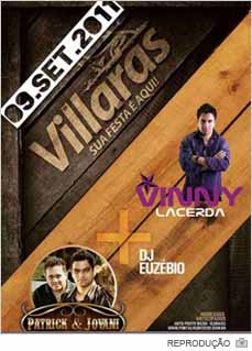 Vinny Lacerda, DJ Euzébio, além de Patrick & Jovani agitarão o Villaras nesta sexta-feira, dia 9. Os ingressos antecipados já estão à venda. Aos homens, custam R$ 20. E para as mulheres, R$ 10. Eles podem ser encontrados no Auto Posto Nicão, em Içara. A balada na margem da SC-444 iniciará às 23h.