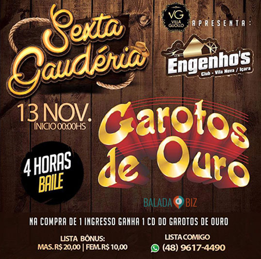 Os Garotos de Ouro movimentarão o Engenhos Club durante quatro horas de baile na Sexta Gaudéria. A festa no bairro Vila Nova acontecerá a partir da meia-noite com ingressos a R$ 20 aos homens e R$ 10 para as mulheres com nome na lista. Para fazer parte basta entrar em contato pelo telefone (48) 9617-4490. Além do ingresso, os participantes receberão também um CD.