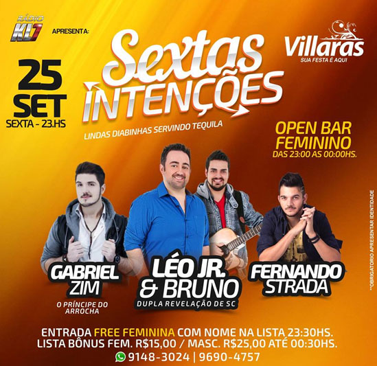 As lindas diabinhas servindo tequila retornam ao Villaras numa balada de Sextas Intenções neste dia 25. A festa no casarão do bairro Liri iniciará às 23h com bebida liberada para as mulheres até o último minuto de sexta-feira. No palco, as atrações ficarão por conta de Gabriel Zim, Léo Jr & bruno, além de Fernando Strada. Até 0h30 os ingressos femininos serão R$ 15 e os masculinos R$ 25. Mas elas poderão também entrar gratuitamente com nome na lista até às 23h30. Basta fazer o cadastro em www.ondetembalada.com.
