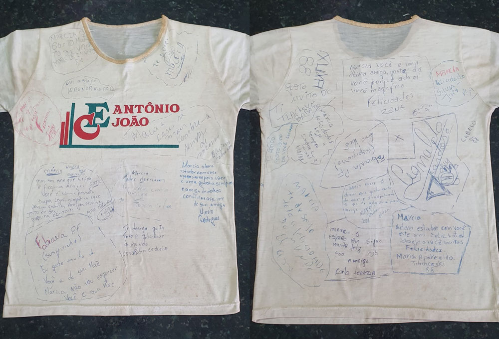 Outro resgate foi uma camiseta da Márcia Serafim que tem as assinaturas do oitavo ano A. Uma verdadeira relíquia com seus 35 anos. Encontrei minha assinatura nessa camiseta. Descobrimos que a Márcia Serafim, que era tão exemplar, colou de mim na prova de Português; eu também confessei ser amadora no quesito cola. Certa vez, quando a carteira era de dois lugares, coloquei um papel escrito com a matéria da prova colado com durex ao redor, no banco onde sentava. No final, a professora pediu para ir lá pra frente entregar a prova, e foi aí que quase fui descoberta. Depois disso, nunca mais tentei colar; serviu de lição.