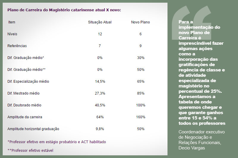 O projeto inclui atualmente a descompactação salarial a partir do nível II (licenciatura curta); permanência do nível médio e licenciatura curta na tabela salarial; manutenção da vinculação do salário do professor ACT à tabela salarial; amplitude horizontal de 50% para o nível III (licenciatura plena); diferença de 50% entre os níveis de licenciatura plena e médio (professor estável); ampliação das possibilidades de avanço na carreira com a criação de duas referências (H e I); gratificação de 15% para professor que atua nas séries iniciais e educação especial e ingresso na última referência com 24 anos.