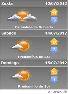 Neste próximo sábado e domingo, uma massa de ar frio e seco resulta no predomínio de Sol e temperatura baixa em todo o Estado. Isto acompanhado a condições para formação de geada nas áreas altas do Oeste ao Planalto. Vento de oeste a sudoeste, fraco a moderado.