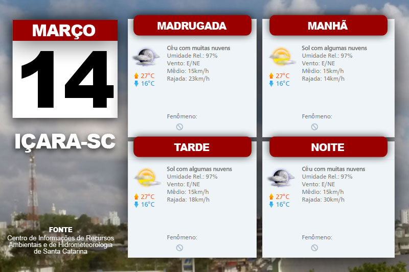 O Sol aparece na maior parte do estado nesta segunda-feira. O Centro de Informações de Recursos Ambientais e de Hidrometeorologia de Santa Catarina indica ainda temperatura mais baixa no Litoral e em elevação no interior. O vento ocorre fraco a moderado: sudeste a nordeste no litoral e nordeste no interior.