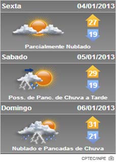 No sábado há predomínio de Sol em Santa Catarina. A partir da tarde as nuvens aumentam favorecendo pancadas isoladas de chuva com trovoadas do Oeste ao Planalto e no Vale do Itajaí devido ao calor. No domingo aberturas de Sol também pela manhã com aumento de nebulosidade e pancadas de chuva com trovoadas em boa parte do estado entre a tarde e noite devido ao calor.