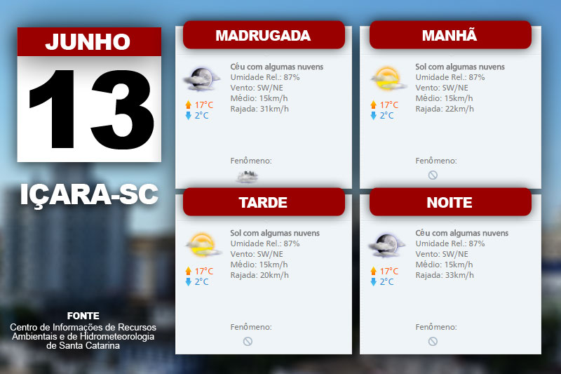 Os nevoeiros isolados seguem pela manhã e Sol com poucas nuvens no decorrer do dia. A temperatura baixa na madrugada se estende pelo amanhecer e retorna à noite com condição isolada de geada. Para o dia, o Centro de Informações de Recursos Ambientais e de Hidrometeorologia de Santa Catarina indica então temperatura em pequena elevação. Além disso, a previsão é de vento leste a nordeste, fraco a moderado.