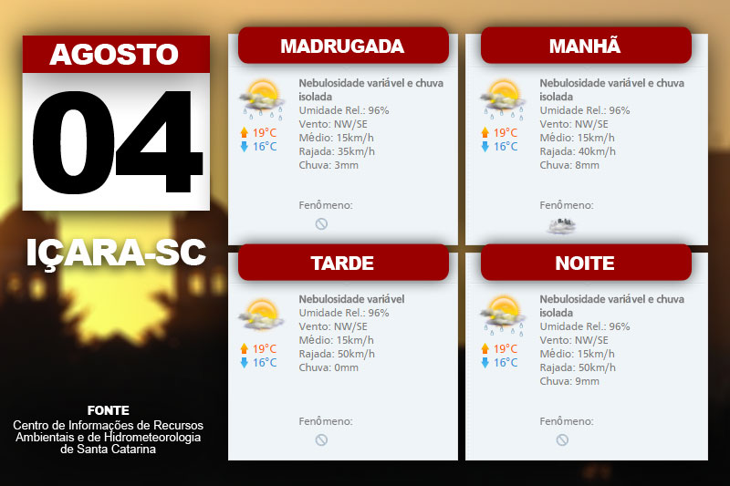 A presença de nuvens possibilita chuva no Planalto Sul e Litoral Sul de Santa Catarina nesta terça-feira, dia 4. A condição se estende ainda até a Grande Florianópolis no fim do dia devido ao deslocamento de uma frente fria pelo oceano. “A temperatura diminui especialmente no Litoral, onde os ventos predominam de sudeste moderado com rajadas”, aponta a meteorologista do Centro de Informações de Recursos Ambientais e de Hidrometeorologia de Santa Catarina, Gilsânia Cruz.