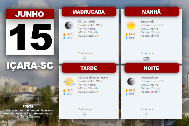 Mesmo com o Sol entre nuvens ao longo do dia, a temperatura sobe nesta quarta-feira. Além disso, o Centro de Informações de Recursos Ambientais e de Hidrometeorologia de Santa Catarina indica vento nordeste, fraco a moderado.