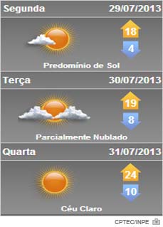 De segunda a quarta-feira ocorrem nevoeiros ao amanhecer e predomínio de Sol em Santa Catarina no decorrer do dia. Mais nuvens durante a tarde na quarta-feira. Temperatura em gradativa elevação, vento de sudeste na manhã de segunda-feira passando a nordeste no restante do período, fraco a moderado com rajadas no Litoral Sul a partir de terça-feira.