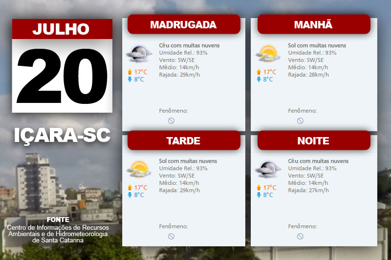 Mais nuvens aparecem do Planalto ao Litoral. Todavia, a chance de chuva fraca se restringe ao Litoral Norte. O Centro de Informações de Recursos Ambientais e de Hidrometeorologia de Santa Catarina indica também temperatura em gradativa elevação, além de vento fraco de sudoeste a sudeste nesta quarta-feira.