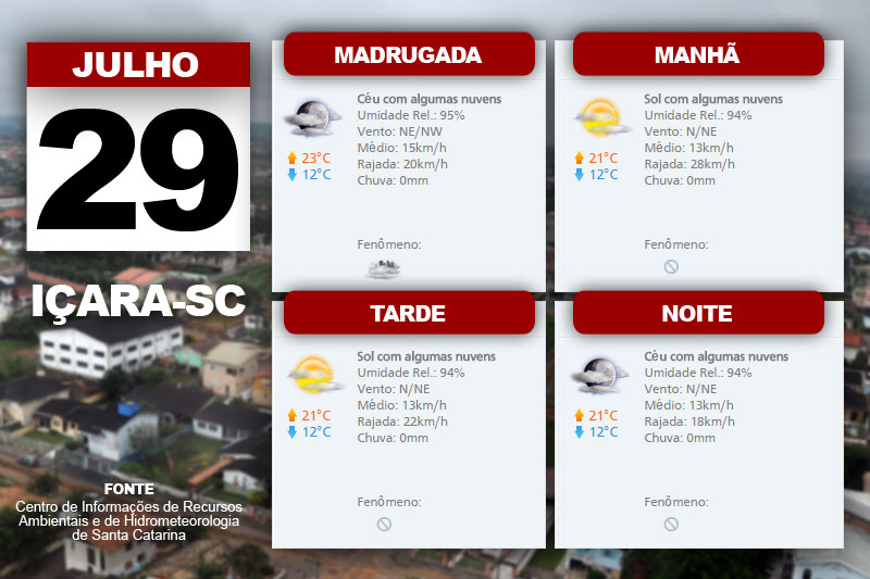 Quarta-feira é mais um dia para o predomínio do Sol e a elevação da temperatura em Santa Catarina. O ar seco permanecerá pelo menos até sábado sobre o Sul do Brasil. Com isso manterá o tempo firme com poucas nuvens. “Temperatura elevada para a época do ano no período da tarde. Vento de nordeste a noroeste, fraco a moderado”, indica o meteorologista do Centro de Informações de Recursos Ambientais e de Hidrometeorologia de Santa Catarina, Marcelo Martins.