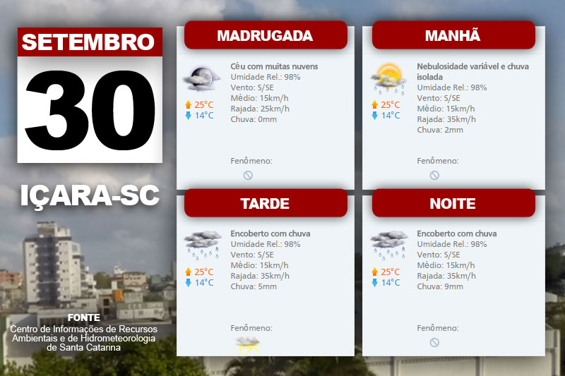 A nebulosidade aumenta em todo o estado com chuva e trovoadas a partir do Oeste e Norte, especialmente nas áreas mais próximas ao Paraná. No decorrer do dia, a instabilidade desloca para sul e provoca chuva na maioria das regiões. “Temperatura em pequena elevação durante o dia. Vento de sul a sudeste, fraco a moderado”, acrescenta a meteorologista do Centro de Informações de Recursos Ambientais e de Hidrometeorologia de Santa Catarina, Gilsânia Cruz.