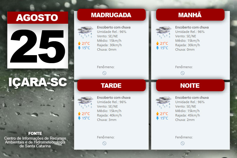 “Temperatura baixa na madrugada e em elevação durante o dia. Vento de sudeste a nordeste, fraco a moderado, com rajadas mais intensas no Litoral”, completa a meteorologista do Centro de Informações de Recursos Ambientais e de Hidrometeorologia de Santa Catarina, Laura Rodrigues.