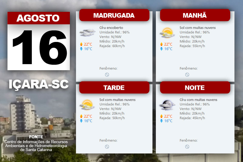 O Sol reaparece com algumas nuvens. O Centro de Informações de Recursos Ambientais e de Hidrometeorologia de Santa Catarina indica ainda temperatura em elevação durante o dia, mas com mínima em ligeiro declínio, além de vento nordeste a noroeste, fraco a moderado.