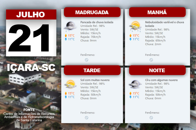 O dia começa com chuva no Centro e Leste de Santa Catarina por influência da frente fria. Mas terá melhora com Sol no decorrer do dia em todas as regiões. No Oeste o dia já inicia com tempo mais seco. “Durante o dia, temperatura amena. Vento de sudoeste a sudeste, moderado, com rajadas”, completa a meteorologista do Centro de Informações de Recursos Ambientais e de Hidrometeorologia de Santa Catarina, Gilsânia Cruz.