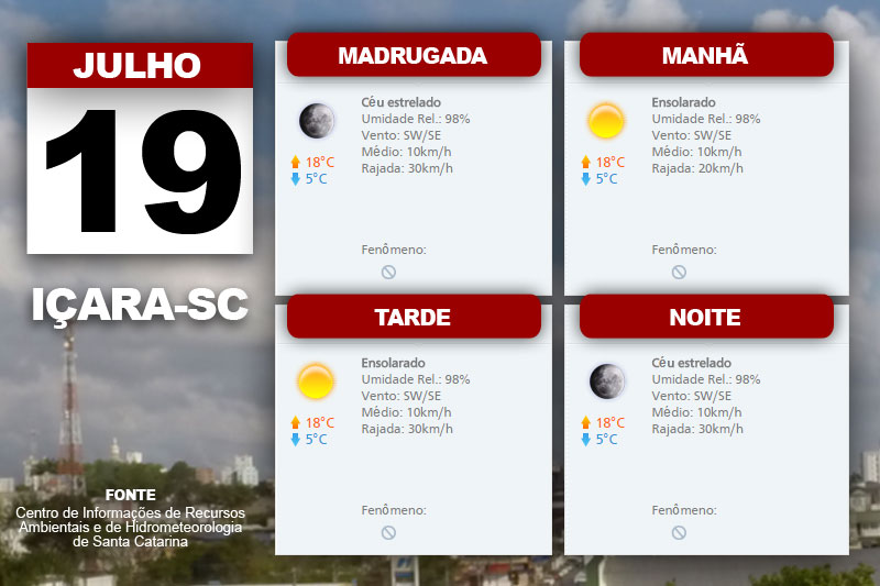 O tempo ensolarado em todas as regiões do estado não significa elevação da temperatura nesta terça-feira. As temperaturas mínimas continuam próximas ou até abaixo de 0°C. O Centro de Informações de Recursos Ambientais e de Hidrometeorologia de Santa Catarina indica vento fraco sudoeste a sudeste.