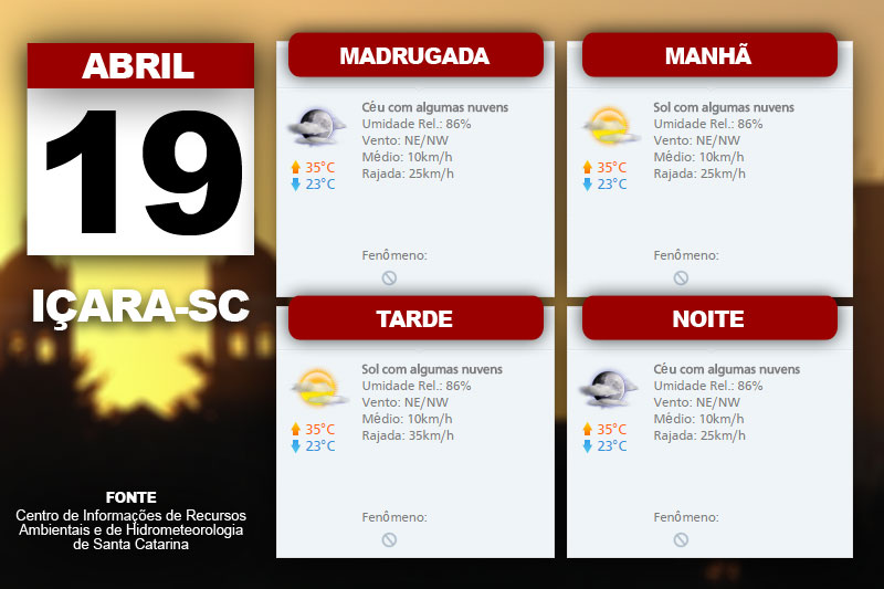 O predomínio de Sol e calor domina no estado ainda nesta terça-feira, dia 19. O Centro de Informações de Recursos Ambientais e de Hidrometeorologia de Santa Catarina indica temperatura alta com máxima acima de 30°C em todas as regiões. Além disso, o Ciram aponta vento nordeste a noroeste, fraco a moderado.