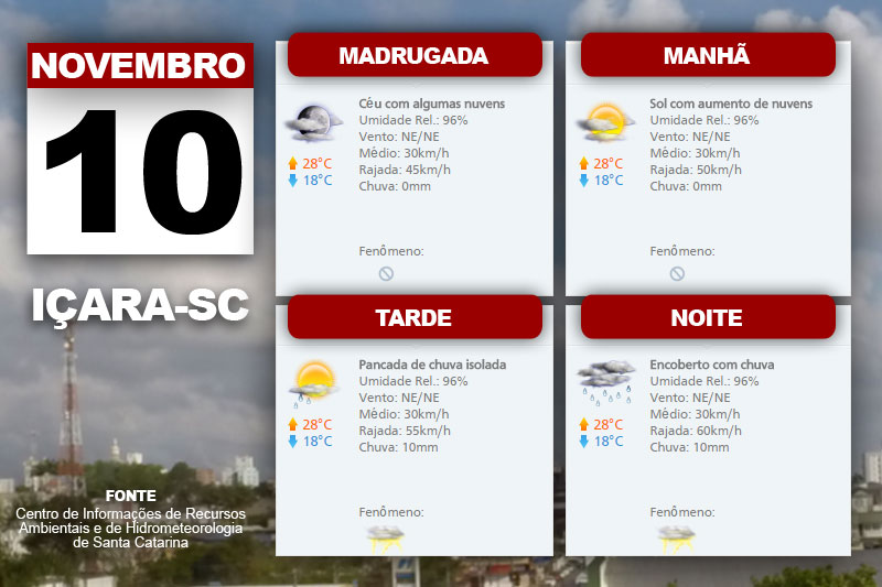 O Sol continua em boa parte do estado até o início da tarde. Isto significa também a elevação da temperatura. Além disso, o Centro de Informações de Recursos Ambientais e de Hidrometeorologia de Santa Catarina indica ainda a possibilidade de aumento de nuvens, pancadas isoladas de chuva e descarga elétrica. Quanto ao vento, a previsão é de rajadas nordeste a noroeste.