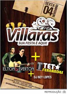 Está em cartaz no Villaras o grupo de Teto Fernandes. Isto significa que será mais um sucesso a festa desta sexta-feira, 4. O evento terá ainda Elton & Everton e DJ Ney Lopes. Os ingressos antecipados podem ser comprados em Içara no Auto Posto Nicão. Em Criciúma, estão disponíveis também no Auto Posto Chile da Próspera. Os bilhetes custam R$ 20 aos homens e R$ 10 para as mulheres.