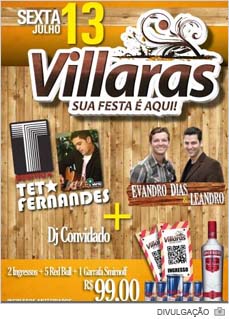 Teto Fernandes será a principal atração do Villaras nesta sexta-feira, dia 13. Mas além dele o casarão no bairro Mareli terá ainda Evandro Dias & Leandro. Aos interessados, os ingressos já estão disponíveis. Antecipadamente eles custam R$ 20 aos homens e R$ 10 para as mulheres. A novidade é o combo com dois ingressos, cinco energéticos e uma garrafa de vodka por R$ 99. A compra pode ser realizada no Posto Nicão em Içara e Postos Chile, em Içara e Criciúma.