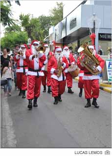 Instrumentos de sobro, tambor e uma bateria ambulante em desfile pela Rua Marcos Rovaris. O show em meio ao trânsito foi novidade nas comemorações natalinas de Içara neste domingo, dia 11. O diferencial da banda foi ainda o uniforme dos músicos. Todos incorporaram o clima, deixaram o vermelho predominar as vestimentas, colocaram o gorro e até se apresentaram com barba.