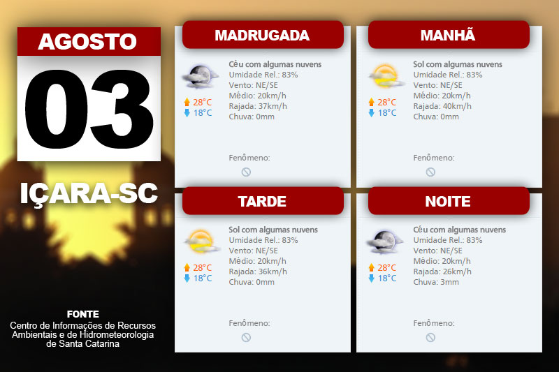 Persiste a condição de veranico com tempo estável e predomínio de Sol em todas as regiões catarinenses nesta segunda-feira, dia 3. Na Terça-feira é que as nuvens aumentam um pouco com chance de chuva no fim do dia no Litoral Sul e Grande Florianópolis devido a uma frente fria que passa pelo oceano. “Nos dias seguintes o tempo volta a ficar mais seco. Vento de nordeste, com variação para sudeste na terça-feira, fraco a moderado”, coloca o meteorologista do Centro de Informações de Recursos Ambientais e de Hidrometeorologia de Santa Catarina, Erikson de Oliveira.