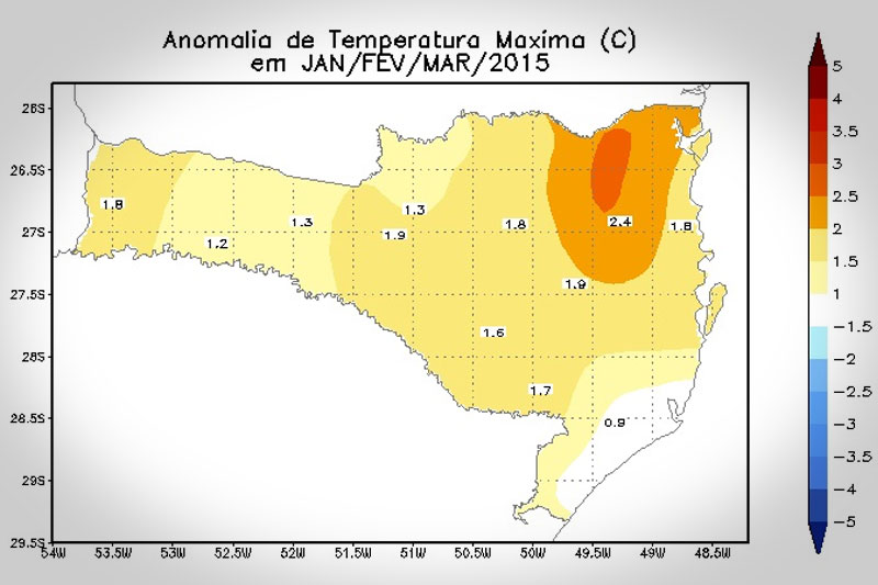 O verão 2014/2015 foi mais quente do que o normal em Santa Catarina. Conforme o Centro de Informação de Recursos Ambientais e de Hidrometeorologia de Santa Catarina, a temperatura máxima ficou até 2ºC acima da média climatológica. Já no caso da chuva, apenas as regiões do Planalto Norte e Alto Vale do Itajaí tiveram com um pequeno déficit até o fechamento da estação nesta sexta-feira, dia 20.