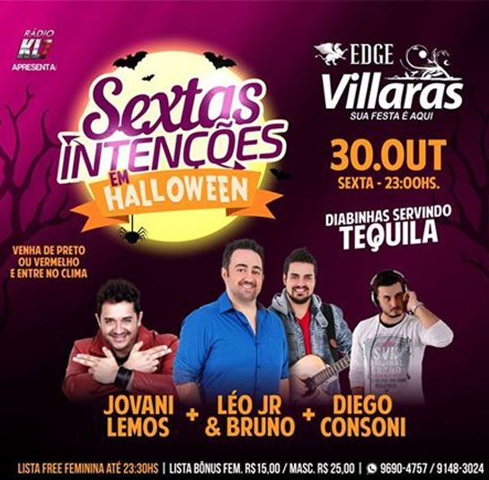 A festa de Sextas Intenções no Villaras acontecerá no clima do Halloween neste dia 30. A balada no casarão do bairro Liri iniciará às 23h com bebida liberada para as mulheres até o último minuto de sexta-feira. No palco, desta vez as atrações ficarão por conta de Jovani Lemos, Léo Jr & Bruno e Diego Consoni. Até 0h30 os ingressos femininos serão R$ 15 e os masculinos R$ 25. Mas elas poderão também entrar gratuitamente com nome na lista até às 23h30. Basta fazer o cadastro em www.ondetembalada.com.