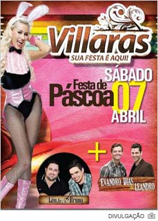Com Léo Júnior & Bruno, além de Evandro Dias & Leandro, o Villaras festejará a Páscoa neste sábado, dia 7. A comemoração na comunidade do Mareli vai garantir também a participação no sorteio de um Saveiro. Os ingressos antecipados estão disponíveis no Posto Nicão por R$ 20 para os homens e R$ 10 para as mulheres. Aos baladeiros, outra possibilidade é participar da lista bônus. O desconto de 50% será dado para quem enviar o nome completo e RG por e-mail para villaras@villaras.net.br.