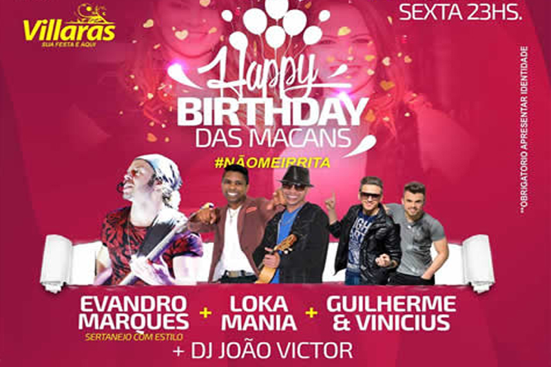 Evandro Marques, Lokamania, Guilherme & Vinicius e o DJ João Victor comandarão o Villaras com a festa Happy Birthday das Macans nesta sexta-feira, dia 14. Além disso, a balada a partir das 23h terá também bebida liberada para as mulheres até às 23h59. Os ingressos antecipados já estão disponíveis na Loja Mury por R$ 25, ou, promocionalmente, por R$ 15. O desconto vale para as mulheres com nome na lista. Para fazer parte basta se cadastrar no site www.ondetembalada.com.