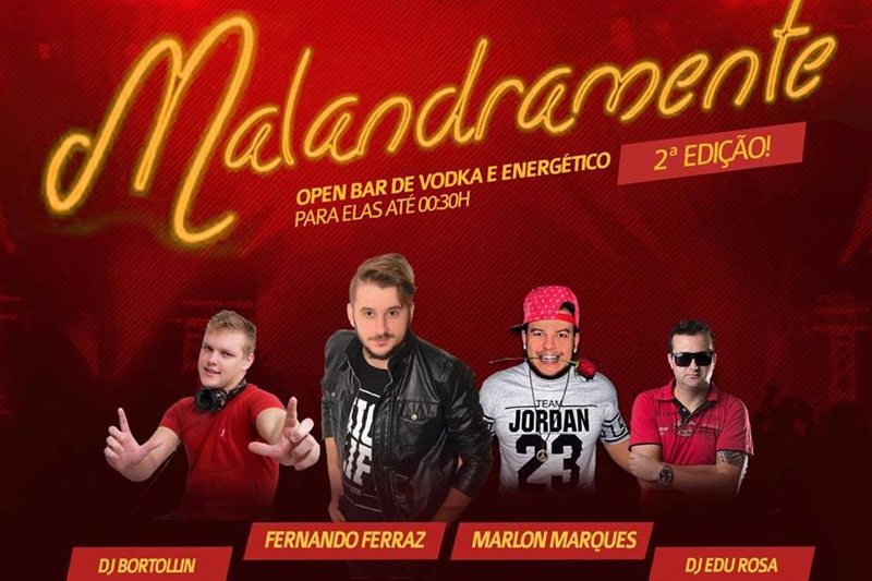 A festa Malandramente vai ter uma segunda edição nesta sexta-feira, dia 28. A festa no Villaras acontecerá com DJ Bortollin, Fernando Ferraz, Marlon Marques e DJ Edu Rosa, além de open bar de vodka e energético para as mulheres das 23h até 0h30 de sábado. Para quem fizer o cadastro pelo Whatsapp (48) 9841-7309 os ingressos masculinos serão R$ 25 e femininos R$ 15 até 1h. As mulheres com nome na lista terão acesso liberado até meia-noite.