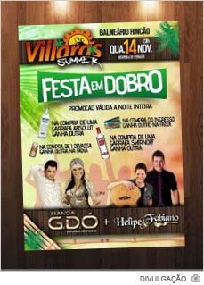 A festa vai ser em dose dupla a partir das 23h desta quarta-feira, dia 14. Na compra de uma garrafa de Absolut, Smirnoff, Devassa e até no ingresso, o segundo será por conta do Villaras. O ambiente Summer receberá ainda GDÓ e a dupla formada por Helipe & Fabiano. Já na sexta-feira, a balada acontecerá no casarão do bairro Mareli, em Içara. Neste caso, com Elton & Everton, além de Gisele & Sandro Henrique.
