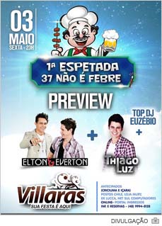 É preciso correr. Somente nesta quinta-feira, os ingressos para o preview da 1ª Espetada estão disponíveis com 50% de desconto. Ou seja, eles podem ser encontrados por R$ 10 no Posto Chile e na Loja Mury. A festa será no Villaras nesta próxima sexta-feira, dia 3. O casarão do bairro Liri receberá como atrações a dupla Elton & Everton, além de Thiago Luz e o DJ Euzébio.