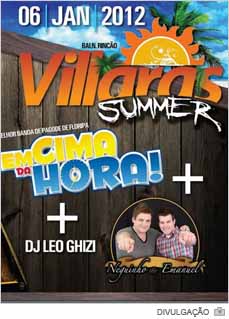 O pagode da banda Em cima da hora, além do sertanejo de Neguinho & Emanuel e o som eletrônico do DJ Leo Ghizi esquentam o verão rinconense nesta sexta-feira, dia 6. As atrações estarão no Villaras Summer. Será a primeira festa da casa noturna em 2012. Os ingressos masculinos antecipados custam R$ 20 e os femininos R$ 10. Os bilhetes podem ser comprados no Posto Nicão de Içara e no Posto Chile da Próspera, em Criciúma.