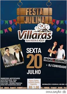Além do menu de bebidas, o Villaras terá quitutes juninos à venda nesta sexta-feira, dia 20. Pipoca, pinhão, cachorro-quente e espetinhos custarão R$ 1 no casarão no bairro Mareli. No quesito musical, a festa temática acontecerá com a participação de Patrick & Jovani, além de Elton & Everton. Aos interessados, os ingressos estão disponíveis antecipadamente no Posto Nicão e Postos Chile. Eles custam R$ 20 aos homens e R$ 10 para as mulheres. Já quem preferir comprar na bilheteria, terá 50% de desconto se aparecer trajado de jeca.