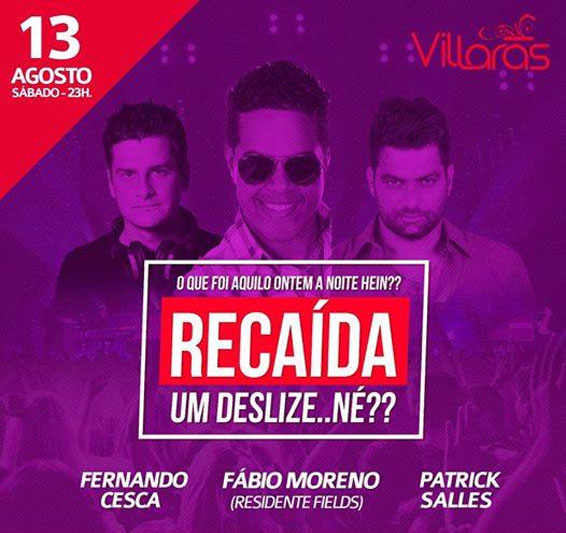 O que foi aquilo ontem a noite? Foi a Recaída do Villaras. A festa no casarão do bairro Liri terá Fernando Cesca, Fábio Moreno e Patrick Salles neste sábado, dia 13. Ficou interessada? O ingresso feminino custará R$ 15. Aos homens, será R$ 25. Os valores valem para quem colocar o nome na listagem da organização pelo Whatsapp (48) 9841-7309 e chegar ao local das 23h à 1h.